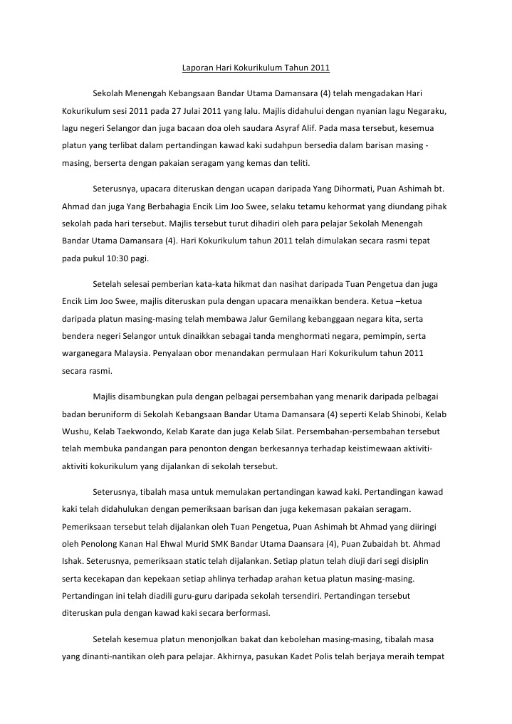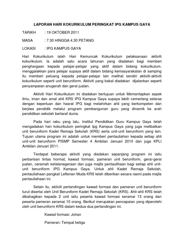 Contoh Laporan Aktiviti Kokurikulum Sekolah Setiap guru penasihat bagi persatuan kelab badan beruniform. 342 jalan nuri rkt kesedar. Surat rasmi memohon cuti bermalam di.